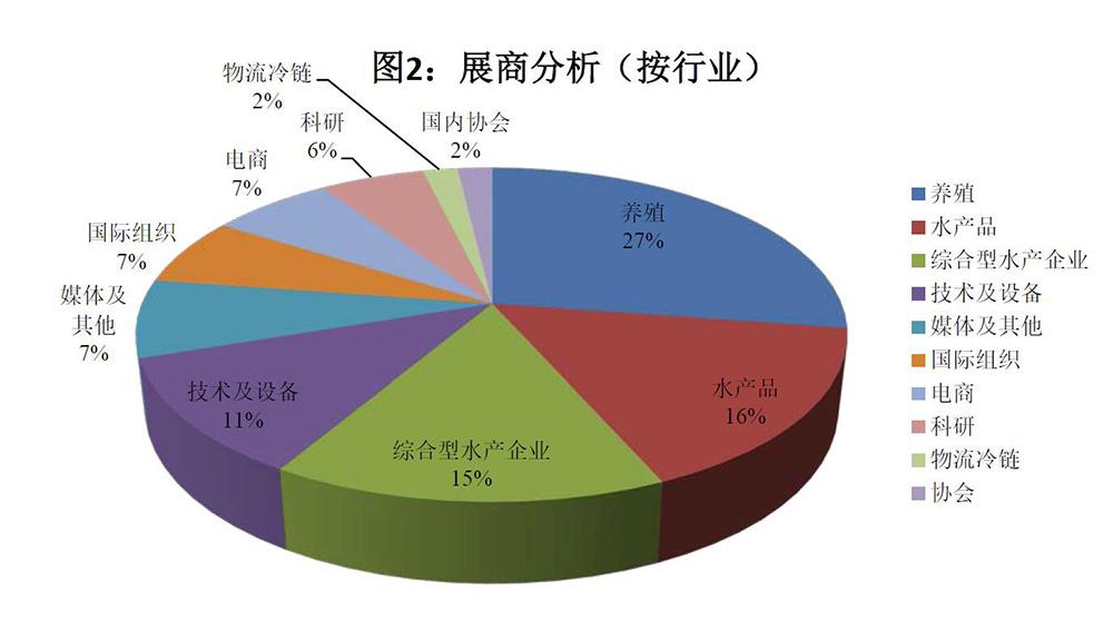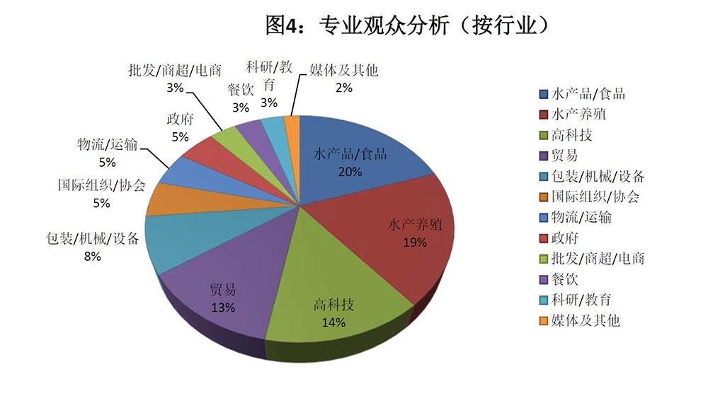 按照企業性質分析,亞太展專業觀眾占比前五的企業類型為:水產品/食品企業(20%)、水產養殖企業(19%)、高科技企業(14%)、貿易型企業(13%),及包裝/機械/設備企業(8%)。